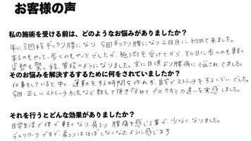 じっくりとお話をする事ができて、細かい事も聞いてもらえましたし、色々と私の知らないことも教えてもらえました。例えば自分の親が股関節症で手術をしているのですが遺伝的に股関節も注意しなければいけない事だったり、知らなかった痛みの原因や注意点を知ることができました。